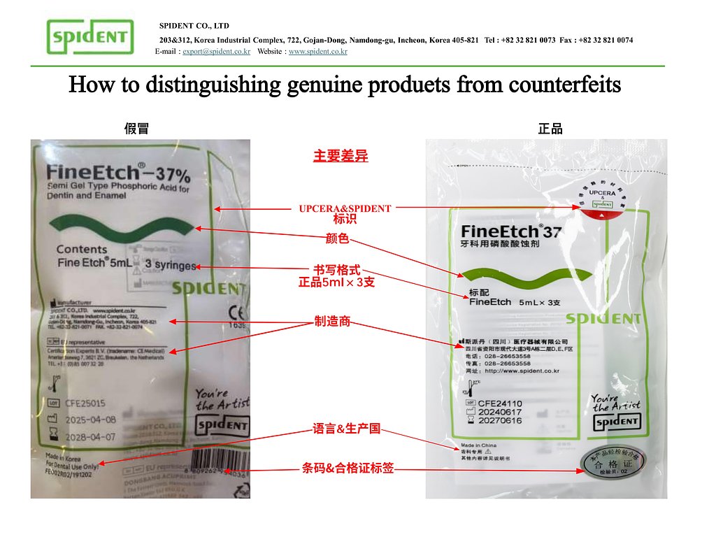 近来,我们发现市场上存在涉嫌销售假冒斯派丹FineEtch牙科用磷酸酸蚀等产品的行为。这些假冒产品来源不明,质量无法保证,为临床工作埋下隐患,重则可能危及患者健康安全。